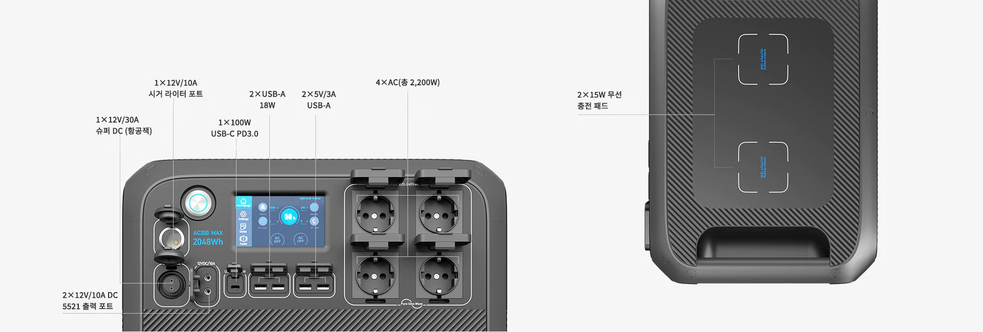 - 1. 출력 전력 및 용량: AC200MAX의 경우 2,000W 정격 출력 및 2,048Wh 용량; AC200P의 경우 2,000W 정격 출력 및 2,000Wh 용량.