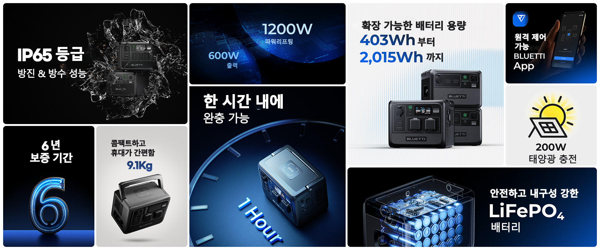 2개 B80 확장용 배터리와 연결하면 (각각 806Wh) 용량 최대 2015Wh로 확장 가능합니다.