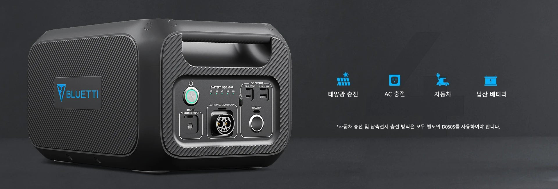 2. 차량용 시거잭 출력 또는 태양광 패널 (BLUETTI D050S - DC 충전기 소요, 별도로 판매).